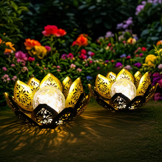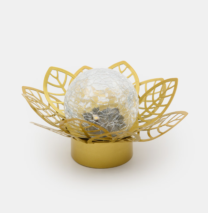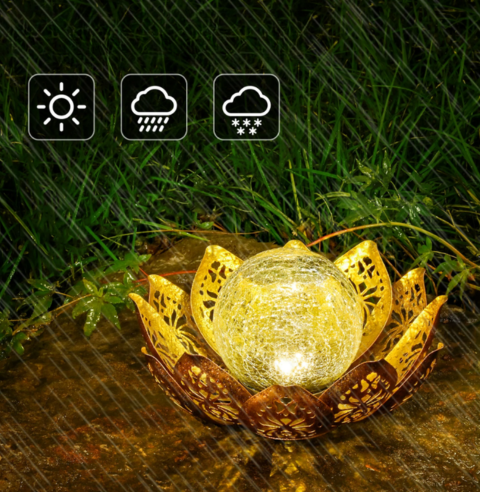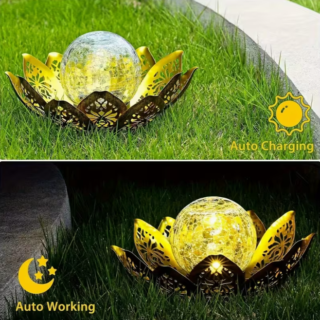 Садовий сонячний LED-світильник у формі квітки — це стильне поєднання естетики та сучасних технологій. Вишуканий дизайн із золотими елементами та скляною кулею створює ефект м’якого мерехтливого світла, яке прикрасить будь-який сад, терасу чи подвір’я.
